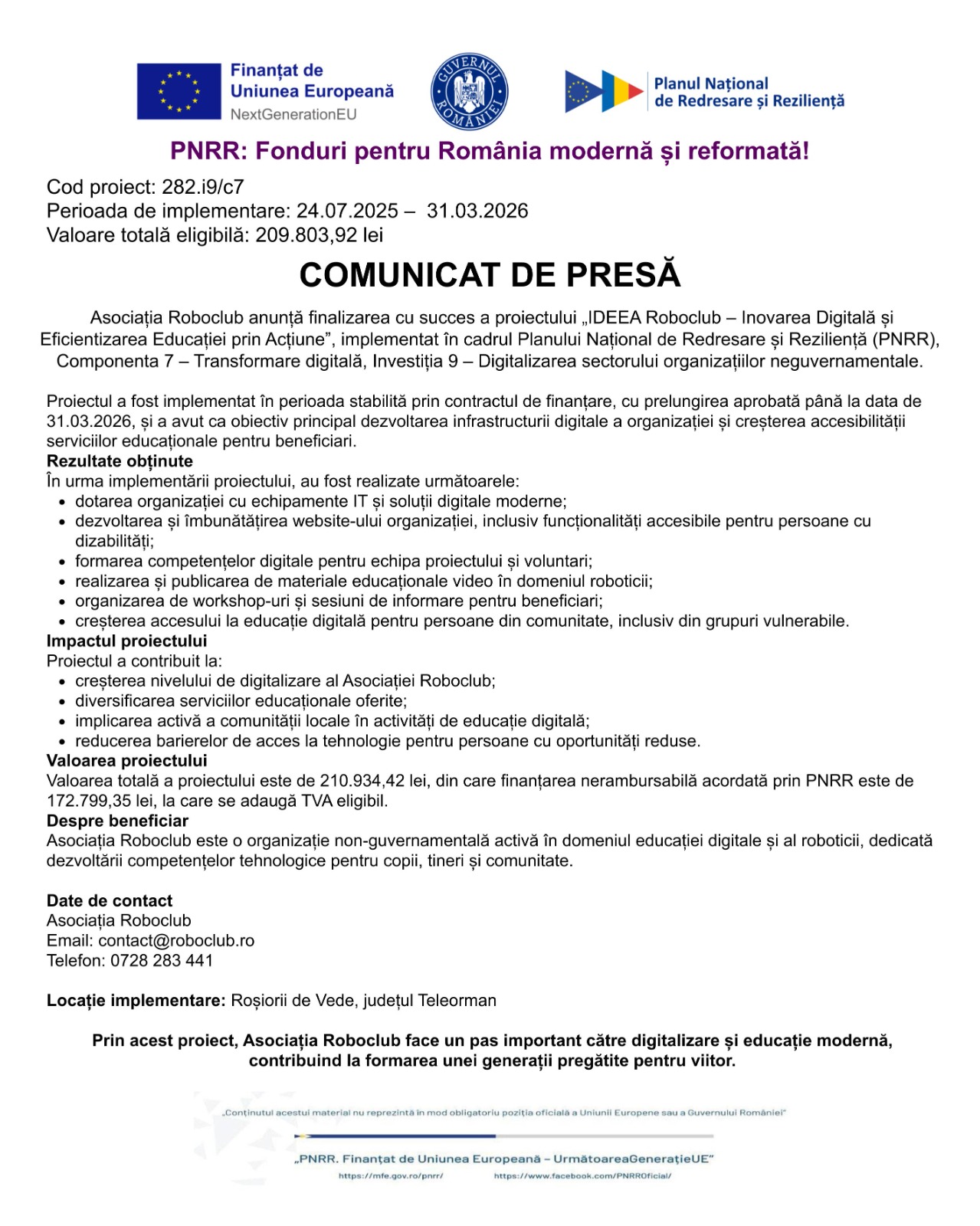 Asociatia Roboclub implementeaza proiectul IDEEA ROBOCLUB – Inovarea Digitalã si Eficientizarea Educatiei prin Actiune, prin Planul National de Redresare Si Rezilienta (PNRR), Componenta C7 – Transformare Digitală, Investitia 19. Cod proiect: 282.19/c7 Perioada de implementare: 24.07.2025 – 31.12.2025 Valoare totala eligibila: 209.803,92 lei Scopul proiectului Proiectul vizeaza cresterea capacitatii digitale a organizatiei prin digitalizarea proceselor interne, modernizarea infrastructurii IT si dezvoltarea competentelor digitale ale membrilor si voluntarilor. Obiective specifice Activitati principale Rezultate asteptate Manager de proiect – Voinea Daniel Email: contact@roboclub.ro Website: https://roboclub.ro/